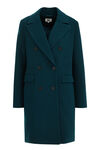 Manteau ajusté de mélange de laine à deux poches à rabat et double fermeture boutonnée. Modèle à col classique, poche intérieure et fente derrière.