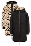 Cette veste se porte des deux côtés. Un côté à look matelassé et l'autre côté en fausse fourrure avec motif. Modèle à capuchon, fermeture éclair avec protège-menton et deux poches fendues à fermeture à bouton-pression.