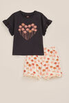 Dormir avec une touche d'espièglerie. Ce pyjama est doté de volants aux extrémités des manches et d'un grand imprimé sur le pan avant. Les bas à motifs, les jambes courtes et les volants du dessous complètent l'ensemble. Un pyjama de rêve !