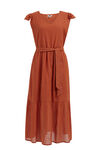 Robe de coton regular fit à motif et fils pailletés. Modèle à col en V, manches courtes et ceinture à nouer.