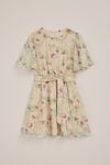 Jolie robe à col rond, taille élastiquée ornée d’un nœud, manches trompettes (tissu semi-transparent). La robe est composée d'une couche supérieure semi-transparente avec un imprimé floral et papillon. Sous cette couche se trouve une sous-robe. Elle a une petite longueur.