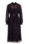 Une robe en lurex de coupe droite avec un motif unique et une structure élégante. Ce modèle présente un motif amusant et possède une encolure ronde et des manches longues. La robe tombe au-dessus du genou.