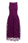 Robe midi sans manches de dentelle ajourée et doublure. Modèle à col rond, cut-out dans le cou et fermeture éclair et boutonnée. Modèle à ceinture à motif ajouré et jupe froissée.