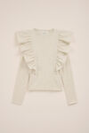 Faites de chaque tenue une fête ! Ce T-shirt de coupe regular est fait d'un mélange de viscose et présente une texture côtelée, un col rond et des manches longues. Les clous, les volants et le fil pailleté font de cet article un véritable accroche-regard pour chaque fille.