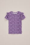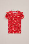 Un look mignon à tout moment. Ce T-shirt imprimé a une coupe ajustée, des volants aux manches courtes et est fabriqué dans un tissu côtelé doux avec une encolure ronde classique.