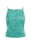 Top ajusté de dentelle à dos ouvert et fermeture à nouer. Modèle à encolure carrée et bretelles spaghettis.