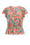 Top regular fit de mélange de polyester recyclé à motif, ruchés et taille élastique. Modèle à col à revers à fermeture à bouton-pression et manches courtes.