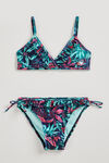 Bikini de polyester recyclé à volants et motif fleurs sur toute la surface. Haut à bretelles ajustables, volants devant et fermoir de plastique dans le dos. Slip avec volants le long du bord et nœuds décoratifs sur les côtés.