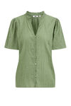 Chemisier de coton regular fit à structure et fils pailletés. Modèle à col rond avec ruchés, manches courtes et fermeture boutonnée.