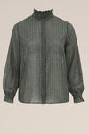 Brillez comme une boule à facettes ! Ce chemisier de qualité tissée présente des paillettes, des manches longues, une fermeture boutonnée et un col rond à ruchés. Ainsi, même la journée de travail la plus ennuyeuse se transformera en une fête branchée.