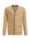 Gilet de pur coton regular fit à structure côtelée. Modèle à col en V, fermeture boutonnée, deux poches passepoilées décoratives et manches longues.