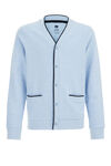 Gilet de pur coton regular fit à structure côtelée. Modèle à col en V, fermeture boutonnée, deux poches passepoilées décoratives et manches longues.