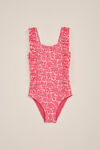 Faites-vous remarquer avec style ! Ce maillot de bain en jersey recyclé a des volants qui partent des bretelles jusqu'au maillot de bain. Qu'elle nage ou qu'elle s'amuse, votre petite fashionista aura toujours fière allure.
