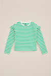 Un article indispensable pour toutes les filles. Ce T-shirt 100% coton à la coupe regular fit présente un col rond et des manches longues. Il est égayé par des volants sur la ligne d'épaule et un joyeux motif à rayures.