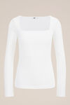 Découvrez la commodité de ce T-shirt en viscose mélangée avec structure côtelée et stretch. Cet article ajusté présente une encolure carrée et des manches longues : c'est la combinaison parfaite de style et de confort.