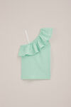 Estival et très élégant. Ce top à une épaule présente une coupe slim fit, une encolure volantée avec broderie anglaise et une bretelle transparente de l’autre côté pour un détail subtil.