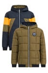Veste de qualité imperméable qui se porte des deux côtés. Un côté est à bloc de couleur et l'autre est de couleur unie. Modèle à manches longues, capuchon, fermeture éclair avec protège-menton et deux poches fendues.