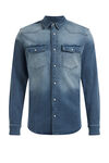 Chemise regular fit de mélange de coton à fermeture boutonnée et deux poches fendues à bouton-pression. Modèle à col classique et manches longues.