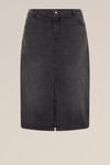 Jupe denim high rise de mélange de coton avec deux poches jeans et deux poches derrière. Modèle à fente devant fermeture éclair et boutonnée.