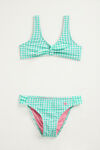 Bikini entièrement doublé à détails de boutons et motif pied-de-poule. Haut à fermoir de plastique dans le dos et bretelles réglables et slip à détail de pli.