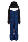Combinaison de ski imperméable en matière respirante. Modèle à motif et fermeture éclair avec protège-menton. Modèle doublé de polaire, à capuchon, ajustement à bande velcro et deux poches fendues à fermeture éclair. La combinaison a une taille élastique, des jambes droites à fermetures éclair, des manches longues à bande velcro et une poche sur la manche gauche.