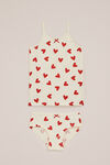 Indispensable dans le tiroir. Cet ensemble se compose d'un maillot de corps et d'une culotte assortie avec des cœurs sur toute la surface. Les bordures en dentelle et les petits nœuds le rendent encore plus mignon.
