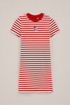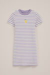 Un véritable look frais et vitaminé ! Cette robe présente une coupe ajustée, un col rond, des manches courtes et des rayures horizontales. Sur la poitrine, une petite broderie de fruits apporte un plus à la tenue.