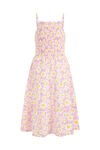 Robe de coton regular fit à motif et smocks dans le haut. Modèle à bretelles spaghetti réglables et volant dans le bas.