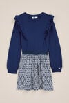 A la fois ludique et élégant. Cette robe associe un haut en coton tricoté à volants et une taille élastique à paillettes. Le bas en viscose à imprimé floral est parfait pour toutes les occasions.