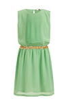 Robe de polyester recyclé regular fit à haut plissé, structure sur toute la surface et paillettes sur la ceinture élastique. Modèle à col rond et fermeture boutonnée.