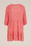Découvrez la commodité d'un style sans effort. Cette magnifique robe en viscose au motif ludique, avec col en V et volants, est parfaite pour une journée chaude. Avec sa coupe classique et ses manches trois-quarts, ce modèle tombe élégamment jusqu'aux genoux et constitue le complément idéal à votre garde-robe estivale.