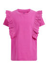 T-shirt de mélange de coton regular fit à broderie anglaise et ruchés. Modèle à col rond et manches courtes.
