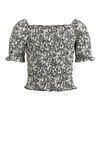 T-shirt ajusté de tricot avec stretch ajouté, motif fleurs et smocks. Modèle à encolure carrée et manches courtes.