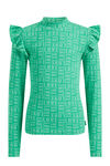 T-shirt ajusté de mélange de coton à motif et volants sur les épaules. Modèle à col droit et manches longues.