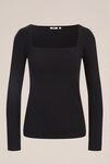 Découvrez la commodité de ce T-shirt en viscose mélangée avec structure côtelée et stretch. Cet article ajusté présente une encolure carrée et des manches longues : c'est la combinaison parfaite de style et de confort.