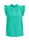 Top de coton regular fit à broderie anglaise et ruchés. Modèle à col rond à fermeture boutonnée et manches courtes.