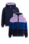 Cette veste se porte des deux côtés. Un côté à motif léopard et broderie et l'autre côté en fausse fourrure avec bloc de couleur. Modèle de veste à fermeture éclair avec protège-menton, deux poches fendues à bouton-pression et manches longues à bords côtelés.