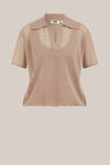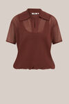 Ce polo finement tricoté présente un effet transparent et est doté d’un débardeur intégré ainsi que d’une coupe ballon élégante. Une pièce minimaliste qui joue sur la texture et la profondeur, parfaite pour un look moderne et féminin.