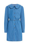 Een regular fit denim jurk van katoen met een kraagje, knoopsluiting en gesmokte, elastische taille. Het model heeft een ronde hals met een knoopsluiting en lange mouwen.