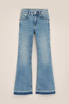 Onmisbaar in de kleerkast van de kinderen! Deze flared Blue Ridge-jeans, gemaakt van een denim-katoenmix met veel stretch, is een echte eye-catcher. Met een rits- en knoopsluiting, een normale taille met verstelbaar elastiek, en flared pijpen, is dit model met vijf zakken perfect voor een trendy look. Tot maat 128 heeft het een haaksluiting.