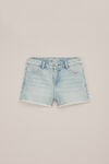 Perfect voor zonnige dagen en coole outfits. Deze slim fit denim short combineert een aansluitende pasvorm met smalle pijpen, gerafelde boorden en subtiele studs, heeft voor- en achterzakken en wordt geleverd met een bijpassende scrunchie.