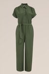 Een opvallende look met extra silhouet. Deze regular fit jumpsuit heeft een overslaghals, rechte pijpen, korte mouwen, handige steekzakken en een knoopsluiting. De taille wordt omsloten door een elastische band en een afneembaar strikceintuur die je figuur perfect accentueren.