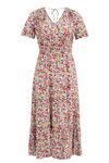 Een jurk van viscose met een dessin en elastische taille. Het model heeft een V-hals en korte mouwen. De jurk valt op de enkels en heeft een open rug met striksluiting.