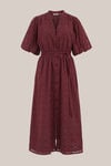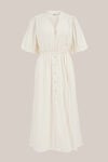 Elegant, comfortabel en krachtig. Deze midi jurk heeft een regular fit, een mao-kraag en korte ballonmouwen met elastische boorden, een knoopsluiting over de gehele lengte en een elastische taille met een dunne strikceintuur. De stof is voorzien van een subtiel structuurpatroon van velvet garen.