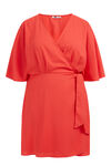 Een regular fit jurk van geweven kwaliteit met een striksluiting. Het model heeft een overslag V-hals en korte mouwen.