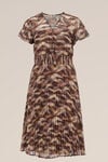 Deze jurk is van 100% recyled polyester en heeft een midi lengte. Het bovenstuk heeft een V-hals, knoopsluiting en korte plissé mouwen. Het taille gedeelte is gesmokt en het onder stuk is geheel plissé. Heeft een onderjurk met dunne verstelbare bandjes.