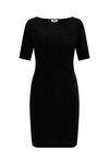 Een velvet jurk met subtiele glittergaren en een boothals. Het model heeft korte mouwen en elegante lengte tot over de knie.