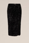 Laat je innerlijke diva schitteren! Deze nauwsluitende rok van velvet kwaliteit met pailletten heeft een plooidetail, een elastische taille met blinde ritssluiting, een split en valt over de knie. Wees het stralende middelpunt van elk feestje.