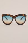 Een subtiele blikvanger. Deze zonnebril met donkerblauwe cat-eye glazen en een bruin montuur met dessin is de perfecte accessoire voor een stijlvolle uitstraling.