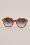 Een ronde klassieker met vintage tint. Deze zonnebril heeft een rond montuur in bruin/oranje streeppatroon en donkergrijze glazen met twee zilverkleurige accenten. Beschermt tegen UVA/UVB en wordt geleverd met een microfiber hoesje.